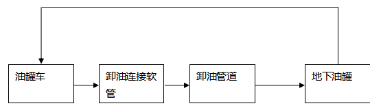 卸油工藝:油罐車行駛至加油站內密封卸油口停車處,利用油罐車與地下儲油罐的高位差,采用密閉式卸油。采用油氣回收系統,在油罐車卸油過程中,將原來儲油罐內散溢的油氣,通過油氣回收地下工藝管線及卸車軟管重新收集至油罐車內,實現卸油與油氣等體積置換。其工藝流程如下圖:
