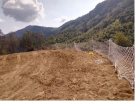 礦山將原1號采場+460m凹陷采坑一邊作為排土場,該凹陷采坑邊坡均為花崗巖體,較為穩(wěn)固,排土場的選址滿足需求。實(shí)際礦山在凹陷坑中間建一座毛石漿砌擋墻(擋墻長40m,高約3m,壩頂寬約1.5m,內(nèi)外坡比約為1∶0.3),排土場有效堆排面積約3800m2,堆置高度約5m,排土場有效庫容量為1.9萬m³,目前現(xiàn)有排土場內(nèi)已堆排的廢石土量約0.5萬m³。 |