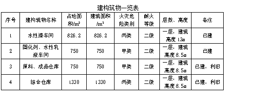 涉及的建構筑物有水性漆(106)車間(利舊),固化劑、水性乳液(104)車間(利舊),綜合倉庫,原料、成品倉庫。