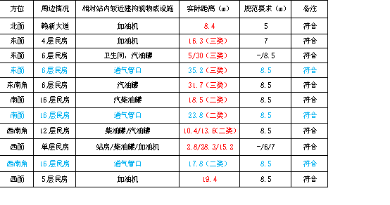西面:有兩棟樓房,其中靠中部為一棟單層民房,距離最近的0#柴油罐28.3m,距離汽油加油機15.2m,靠北端為一棟6層民房,距離相鄰加油機為19.4m。