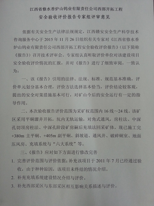 江西省修水香爐山鎢業有限公司評審意見